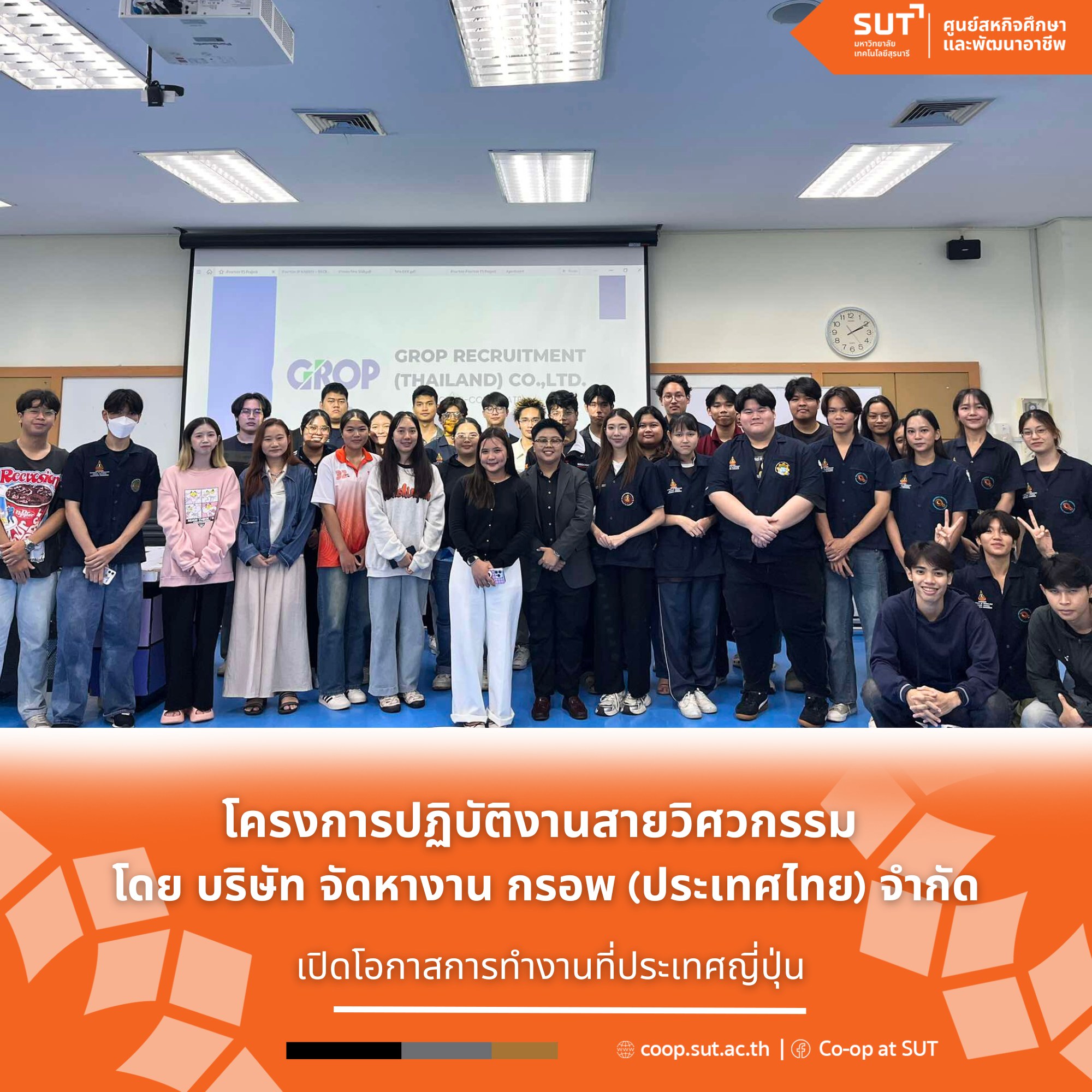 ศูนย์สหกิจศึกษาและพัฒนาอาชีพ ร่วมกับ บริษัท จัดหางาน กรอพ (ประเทศไทย) จำกัด จัดกิจกรรมประชาสัมพันธ์โครงการปฏิบัติงานสายวิศวกรรม ณ ประเทศญี่ปุ่น เมื่อวันศุกร์ที่ 31 ตุลาคม 2568 เวลา 13.30 – 14.15 น. ณ อาคารเรียนรวม 2 มหาวิทยาลัยเทคโนโลยีสุรนารี (มทส.)