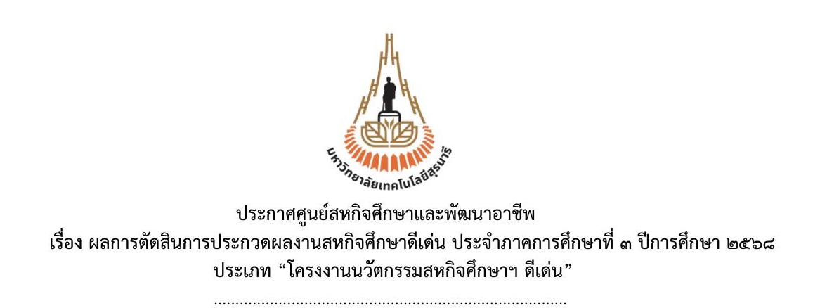 #ขอแสดงความยินดี กับนักศึกษา #มทส. เเละสถานประกอบการที่คว้ารางวัลการประกวด #CWIE ระดับเครือข่ายภาคตะวันออกเฉียงเหนือตอนล่าง ปี 2569 ศูนย์สหกิจศึกษาและพัฒนาอาชีพ ในฐานะสถาบันแม่ข่ายเครือข่ายพัฒนาสหกิจศึกษาภาคตะวันออกเฉียงเหนือตอนล่าง ร่วมกับมหาวิทยาลัยราชภัฏชัยภูมิ จัดประกวดผลงานสหกิจศึกษาเครือข่ายอุดมศึกษาภาคตะวันออกเฉียงเหนือตอนล่าง ณ มหาวิทยาลัยราชภัฏชัยภูมิ จังหวัดชัยภูมิ ระหว่างวันที่ 2-3 เมษายน 2569 ดูรายละเอียดเพิ่มเติม