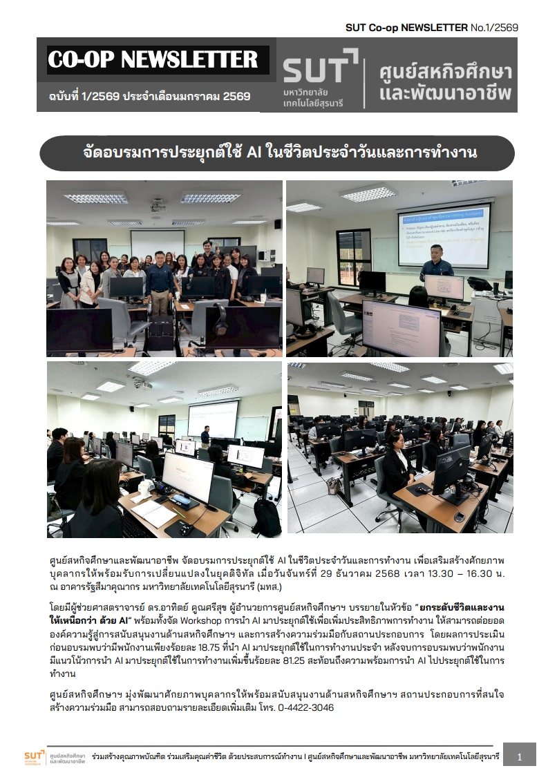ศูนย์สหกิจศึกษาและพัฒนาอาชีพ ได้จัดกิจกรรมอบรมเชิงปฏิบัติการหัวข้อ “#การปรับตัวและการทำงานร่วมกับคนต่างเจเนอเรชัน (Cross-Gen Teamwork & Adaptability)” เมื่อวันที่ 23 พฤศจิกายน 2568 เวลา 9.00 - 16.00 น. ณ ห้อง B3101-3104 อาคารเรียนรวม 1 และ B5201 อาคารเรียนรวม 2 มหาวิทยาลัยเทคโนโลยีสุรนารี (มทส.) โดยมีนักศึกษาเข้าร่วมมากกว่า 150 คน