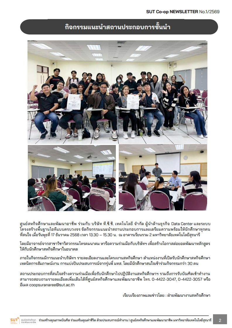 ศูนย์สหกิจศึกษาและพัฒนาอาชีพ หารือความร่วมมือกับ บริษัท ซันเดิลล์ เทคโนโลยี จำกัด ผู้นำด้านการผลิตแผงวงจร PCB ด้วยนวัตกรรมอัจฉริยะ โดยมีผู้ช่วยศาสตราจารย์ ดร. อาทิตย์ คูณศรีสุข ผู้อำนวยการศูนย์สหกิจศึกษาฯ ให้การต้อนรับเมื่อวันศุกร์ที่ 16 มกราคม 2569 เวลา 13.15 น. อาคารศูนย์สหกิจศึกษาและพัฒนาอาชีพ มทส.