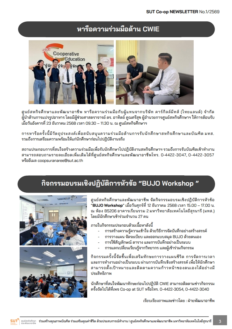 ศูนย์สหกิจศึกษาและพัฒนาอาชีพ ได้จัดกิจกรรมอบรมเชิงปฏิบัติการหัวข้อ “#BUJO Workshop” เมื่อวันศุกร์ที่ 12 ธันวาคม 2568 เวลา 15.00 – 17.00 น.ณ ห้อง B5206 อาคารเรียนรวม 2 มหาวิทยาลัยเทคโนโลยีสุรนารี (มทส.) โดยมีนักศึกษาเข้าร่วมจำนวน 27 คน