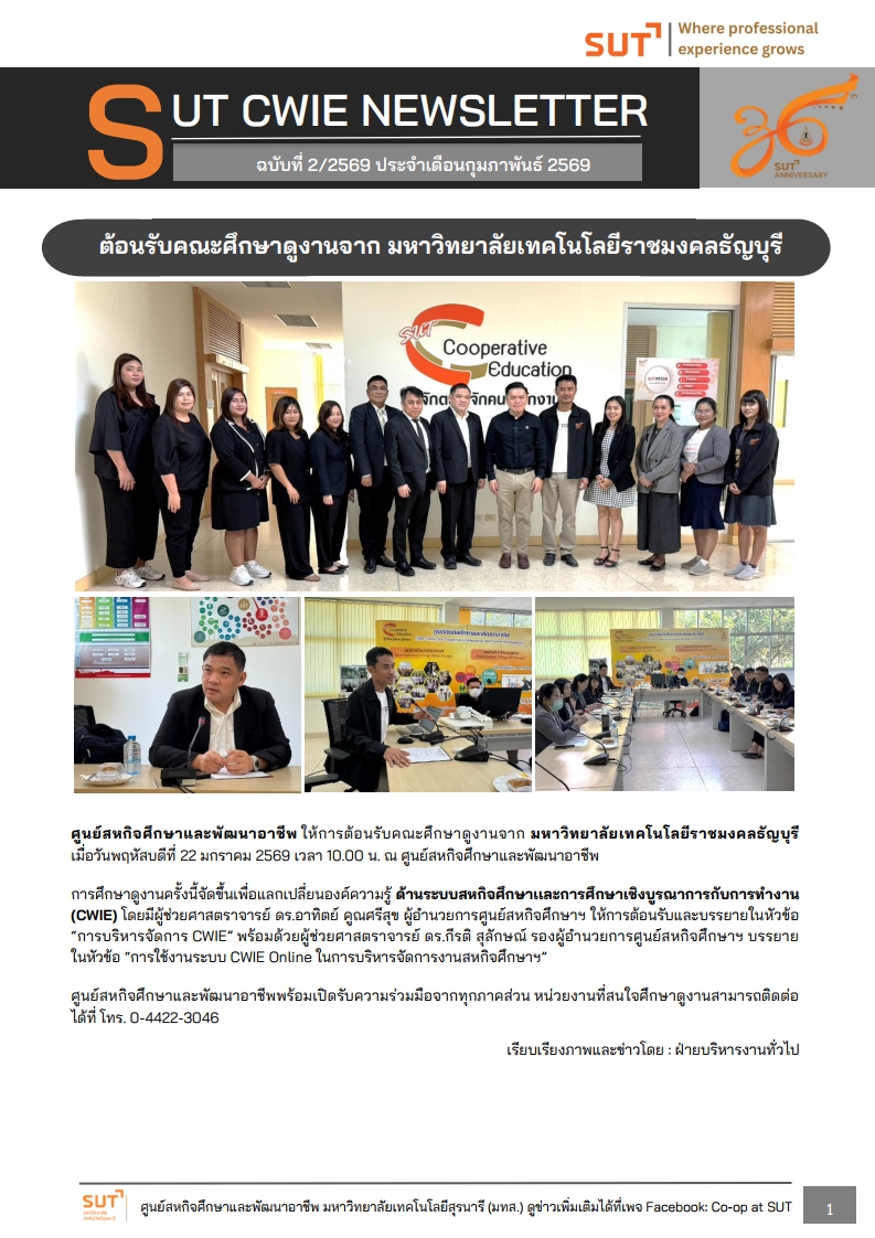 #ขอแสดงความยินดี กับนักศึกษา #มทส. เเละสถานประกอบการที่คว้ารางวัลการประกวด #CWIE ระดับเครือข่ายภาคตะวันออกเฉียงเหนือตอนล่าง ปี 2569 ศูนย์สหกิจศึกษาและพัฒนาอาชีพ ในฐานะสถาบันแม่ข่ายเครือข่ายพัฒนาสหกิจศึกษาภาคตะวันออกเฉียงเหนือตอนล่าง ร่วมกับมหาวิทยาลัยราชภัฏชัยภูมิ จัดประกวดผลงานสหกิจศึกษาเครือข่ายอุดมศึกษาภาคตะวันออกเฉียงเหนือตอนล่าง ณ มหาวิทยาลัยราชภัฏชัยภูมิ จังหวัดชัยภูมิ ระหว่างวันที่ 2-3 เมษายน 2569 ดูรายละเอียดเพิ่มเติม