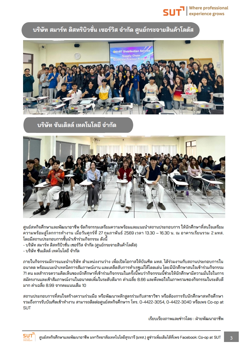 ศูนย์สหกิจศึกษาและพัฒนาอาชีพ จัดกิจกรรม #เตรียมความพร้อมและแนะนำสถานประกอบการ ให้นักศึกษาที่สนใจ #เตรียมความพร้อมสู่โลกการทำงาน เมื่อวันศุกร์ที่ 27 กุมภาพันธ์ 2569 เวลา 13.30 – 16.30 น. ณ อาคารเรียนรวม 2 มทส. โดยมีสถานประกอบการชั้นนำเข้าร่วมกิจกรรม ดังนี้